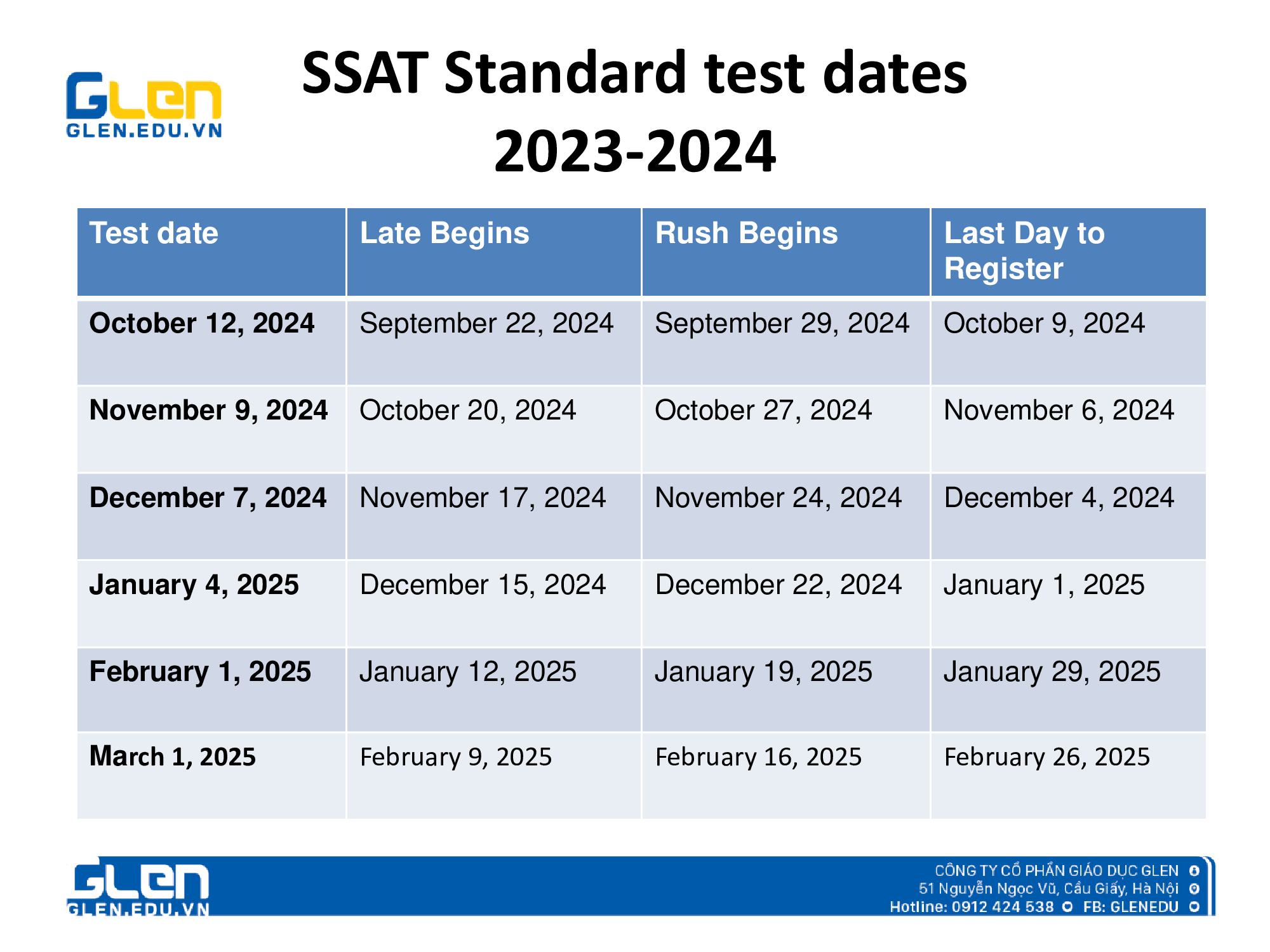 GLEN Education xin gửi đến quý phụ huynh và các em học sinh lịch thi SSAT năm học 2024-2025.