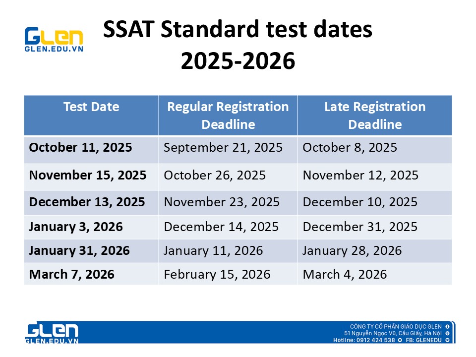 GLEN Education xin gửi đến quý phụ huynh và các em học sinh lịch thi SSAT năm học 2025-2026